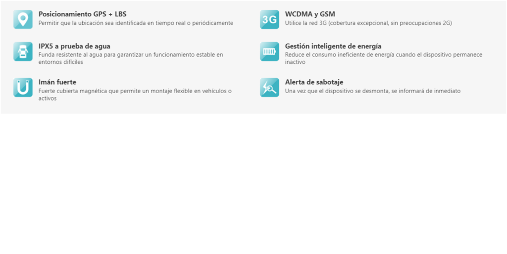 GT6 es un rastreador GPS de activos 3G con frecuencia WCDMA de 850/900/1900 / 2100MHz y frecuencia GSM 850/900/1800 / 1900MHz. Está equipado con una batería de iones de litio de alta potencia que puede durar entre 7 semanas y 2 años, según el intervalo de informe de ubicación.